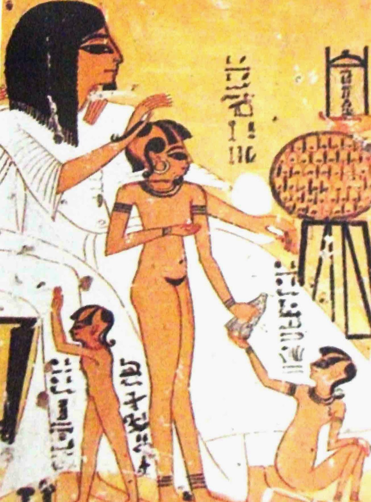 As crianças egípcias raramente eram representadas vestidas. O normal, tanto entre as classes comuns como entre a realeza, eram os infantes viverem nus e descalços (FROOD, 2010). Como uma assinatura de sua infância tanto meninas como meninos usavam um corte de cabelo especifico, constituído por uma cabeça praticamente raspada, exceto por uma mecha lateral comprida (usada normalmente até os dez anos). Em casos especiais, como os das princesas ou príncipes que eram obrigados a chegar à maioridade devido à acessão ao trono, estes eram representados como adultos, ou seja, totalmente carecas, usando perucas ou com os cabelos integralmente crescidos.
