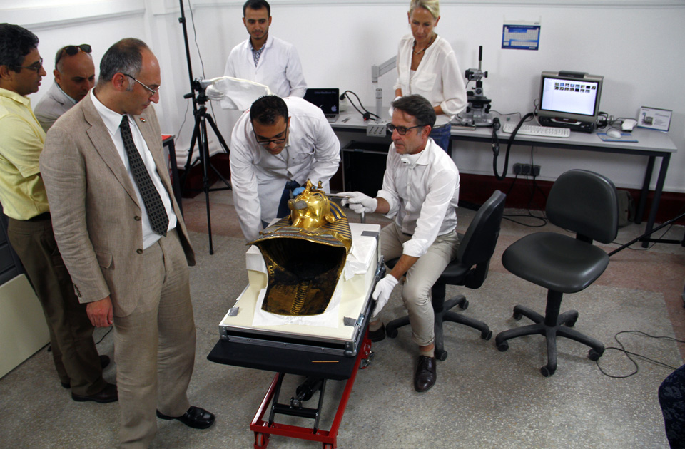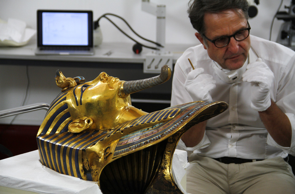 Restoration of Tutankhamun mask underway at Egyptian Museum. Disponível em <http://english.ahram.org.eg/NewsContent/9/40/161407/Heritage/Ancient-Egypt/Restoration-of-Tutankhamun-mask-underway-at-Egypti.aspx>. Acesso em 20 de outubro de 2015.