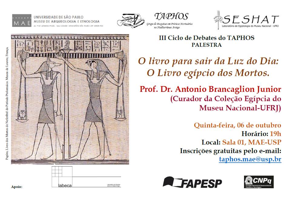 Ocorrerá no próximo dia 06 de outubro, 19h00, a palestra “O Livro para sair da Luz do Dia: o Livro Egípcio dos Mortos”, que será ministrada pelo Prof. Dr. Antonio Brancaglion Jr. (Curador da Coleção Egípcia do Museu Nacional – UFRJ).
