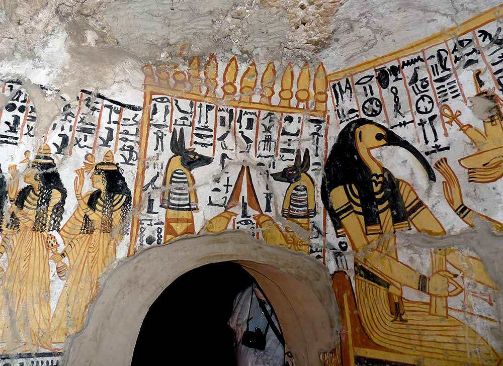 Além dos belos desenhos em suas paredes, outro detalhe que chama bastante atenção é que a sepultura possui uma entrada com formato piramidal, algo que foi utilizado por alguns nobres durante o Novo Império. Essa mini pirâmide é a parte que nós arqueólogos chamamos de “superestrutura”, enquanto que a câmara funerária é a “subestrutura”. Caso queira saber um pouco mais sobre essas mini pirâmides eu mostrei uma no post “A arquitetura dos faraós: túmulos e moradias”.