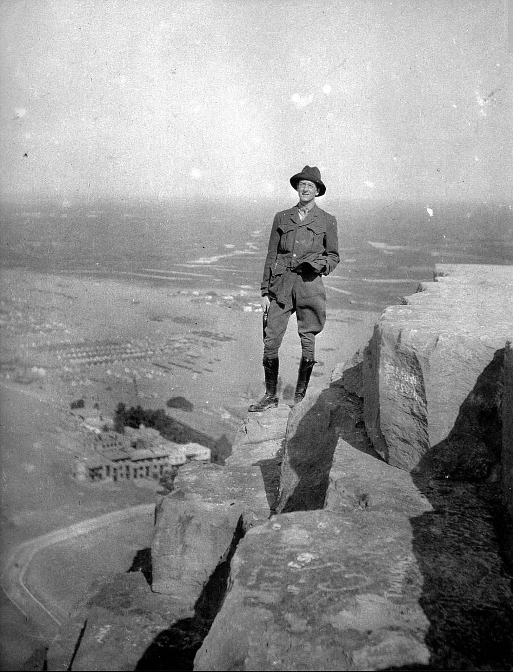 O correspondente australiano, Charles Bean, tirou esta foto em 1915 após escalar a pirâmide de Khufu — algo que nos dias de hoje é altamente proibido —. A fotografia é de autoria de um outro correspondente, Philip Schuler.