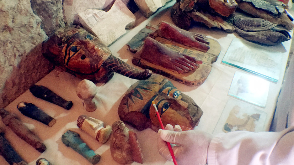 Na área retangular da tumba a equipe encontrou um sarcófago de madeira em bom estado de conservação e uma câmara interna com um poço com mais de 9 metros de profundidade que termina em duas pequenas câmaras. Lá foram encontradas cerca de 1000 pequenas estatuetas, os chamados ushabtis, figuras que se acreditava servir como servos do finado no além vida. Também foram descobertas jarras e maquetes de cerâmica assim como várias máscaras de madeira cobertas com pequenas lascas de ouro.