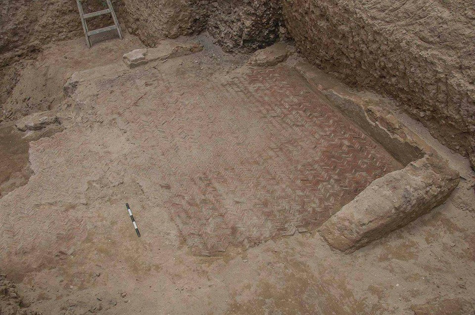 O piso está em perfeito estado de conservação e é formado por trincheiras retangulares de tijolos romanos com desenhos geométricos.