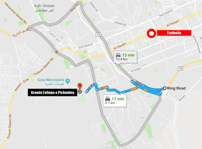 A explosão ocorreu às 18h no corredor El-Maryoutiya, no distrito de Hiram, em Gizé, a aproximadamente sete quilômetros do complexo das Pirâmides e da Esfinge.