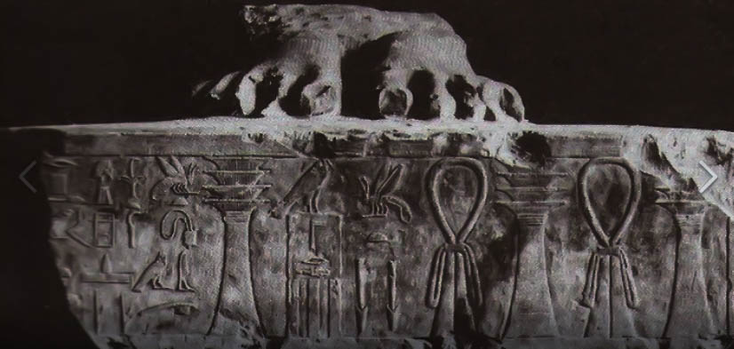 Pés da estátua de Djoser acompanhada de citação ao nome de Imhotep.