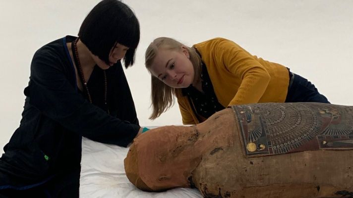 Agora a múmia está passando por uma série de estudos para se conhecer mais acerca deste homem e procurar meios que possibilitem a conservação das pinturas que decoram os objetos que foram encontrados juntos ao corpo: uma máscara funerária, uma cobertura para os pés e dois painéis — os quais um cobria seu tronco e o outro as pernas —. Ambos os painéis foram decorados com cenas funerárias e imagens de divindades. Esses artefatos são feitos com cartonagem, que basicamente é um material feito com tecido de linho coberto com finas camadas de gesso.